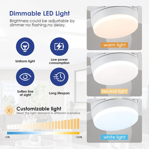 This modern ceiling fan has 3 dimming modes. You can choose from yellow, medium, or white light to easily customize the brightness, as well as choose from 1-6 fan speeds via the remote control, and use the fan's reverse rotation feature to stay cool or warm for year-round comfort.