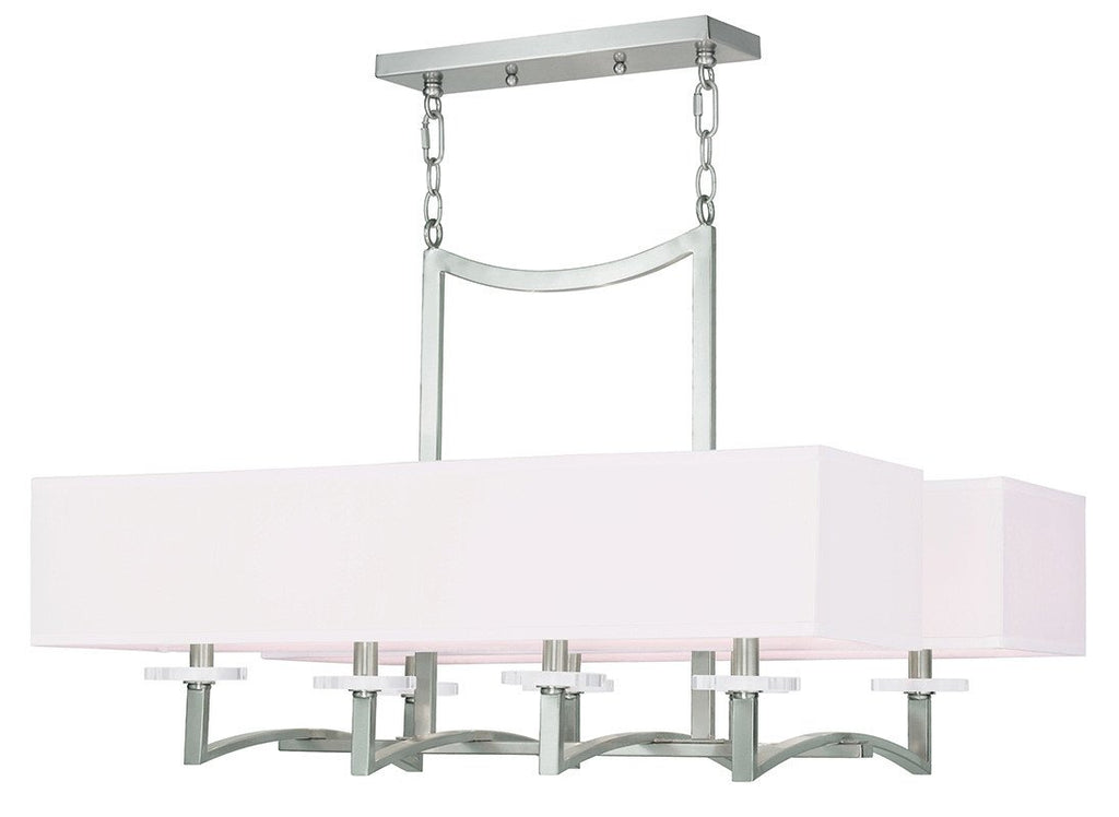 Featuring oversized hand crafted off white fabric hardback shades and crystal bobeches, this Woodland Park linear chandelier is framed and finished in brushed nickel. It's a wonderful way to give a broad and handsome light to dining tables and kitchen islands. The Woodland Park is a must have item for a timeless look in any room.