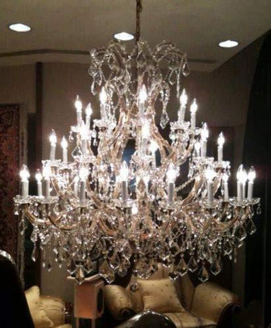 This beautiful Chandelier is trimmed with Empress Crystal(TM) A great European tradition. Nothing was ever quite so elegant as the fine crystal chandeliers that lent sparkle to brilliant evenings in palaces and manor houses across Europe. This version from the Maria Theresa collection is decorated with various 100% crystals that capture and reflect the light of candle bulbs resting in a scalloped bobeche. The timeless elegance of these chandeliers is sure to lend a special atmosphere in every home.Assembly Required Size: W.52" H.52" 36 LIGHTS,