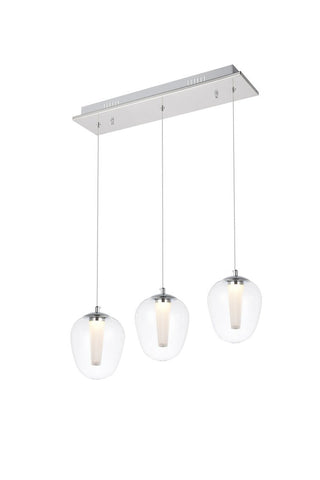 Clear glass shade with chrome finish top encases white textured center point with light inside; 3 hanging in a row.