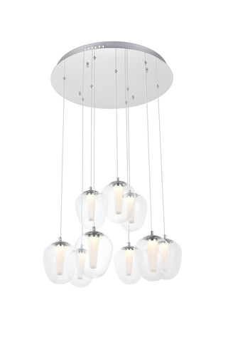 Clear glass shade with chrome finish top encases white textured center point with light inside; 9 hanging together.