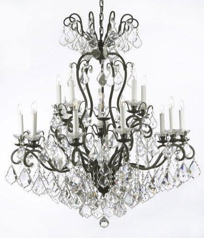 A Great European Tradition. Nothing is quite as elegant as the fine crystal chandeliers that gave sparkle to brilliant evenings at palaces and manor houses across Europe. This beautifully unique version from the Versailles Collection has 100% Crystal that capture and brilliantly reflect the light of the candle bulbs. The frame is all wrought iron, adding the finishing touch to a wonderful fixture. The timeless elegance of this chandelier is sure to lend a special atmosphere anywhere its placed! Please note this item requires assembly. This item comes with 18 inches of chain. size: H44 x W38 16 LIGHTS.